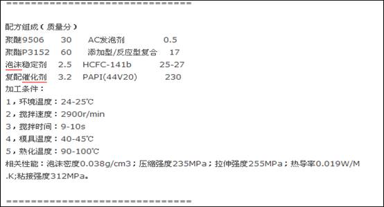 工藝:采用高功能聚醚多元醇和多次甲基多苯基多異氰酸酯為主要原料,在催化劑、發(fā)泡劑、表面活性劑等作用下,經(jīng)化學(xué)反映發(fā)泡而成。